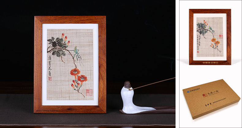 綠蔓如藤不用栽,淡青花繞竹籬開。披衣向曉還堪愛,忽見螳螂帶露來。 花與昆蟲,一靜一動,趣味頓生。本品選用150目原生態夏布,由巴蜀一品特約畫師唐云杰作畫秉承齊白石一派的簡約寫意,紅艷的花蔓在古樸的夏布上更添情致。高檔實木邊框,便攜小巧,在邊框下方及包裝盒上定制企業信息,簡約美觀,專屬性強。
